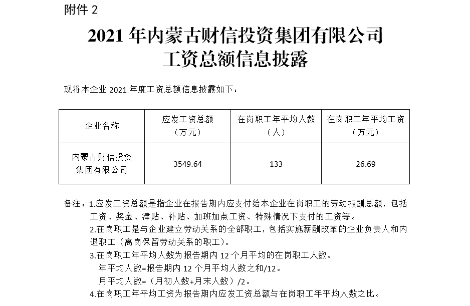 2021年內(nèi)蒙古財信投資集團有限公司 工資總額信息披露